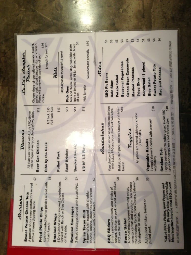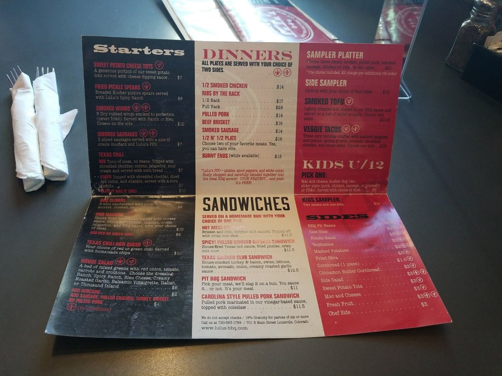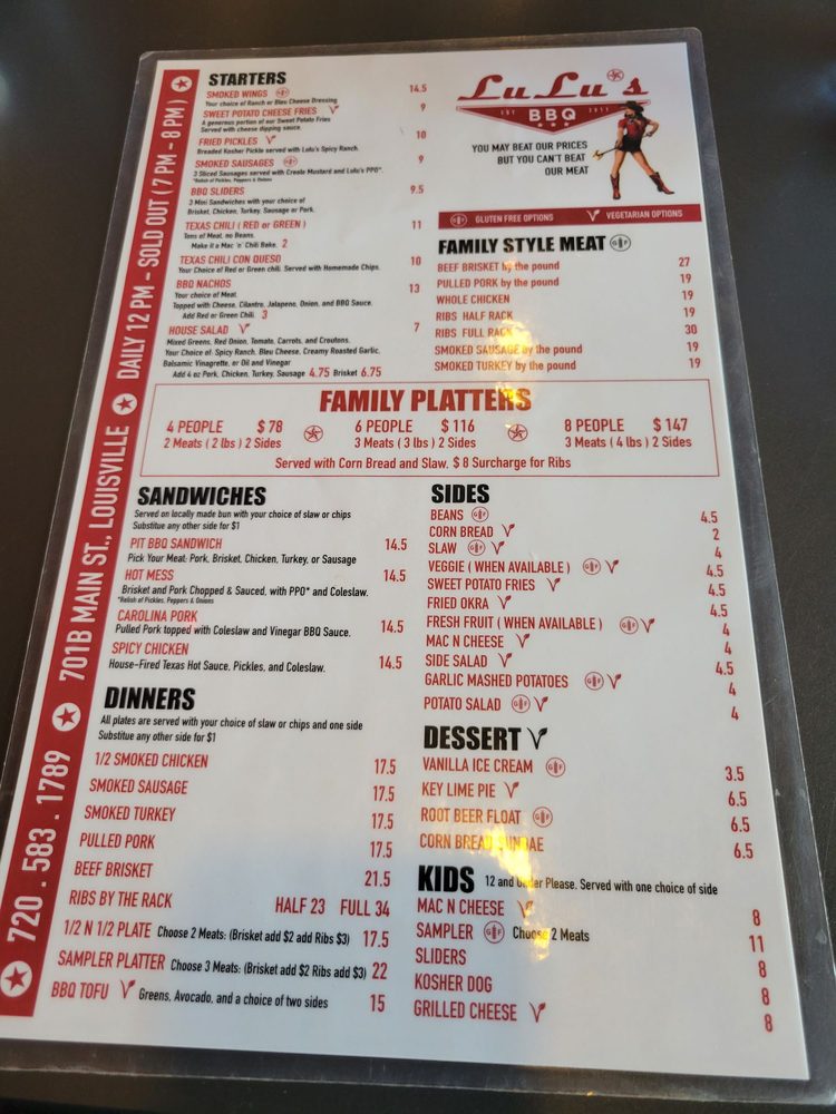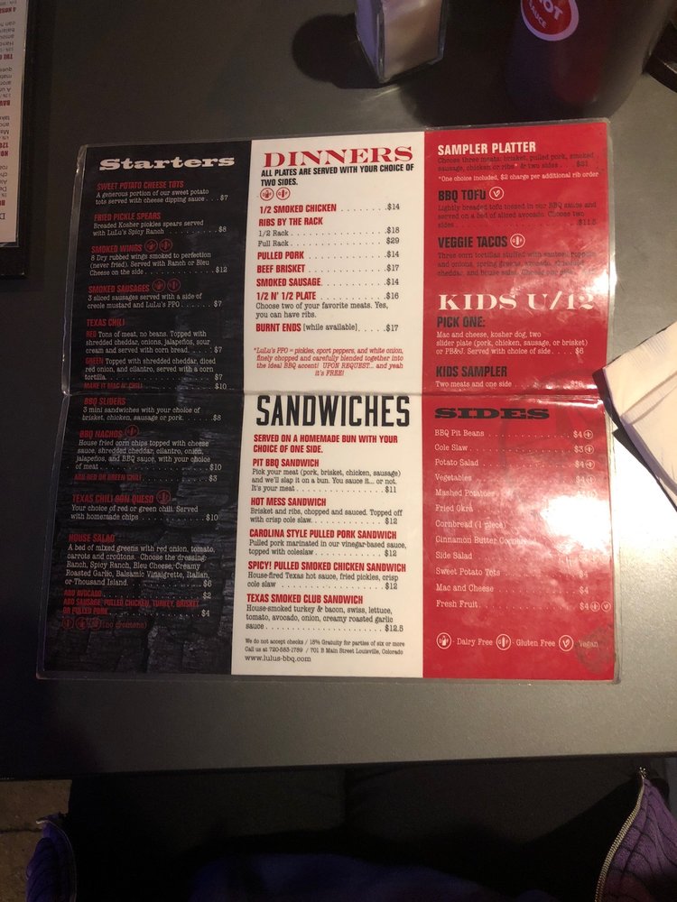Lulu's BBQ is a Southern-style barbecue joint located in Louisville, CO. This casual spot offers a plethora of options, including delivery, takeout, and vegan choices. Known for their generous portions, customers rave about the BBQ mix, kalua pig and rice, katsu chicken, ribs, and brisket nachos. The menu also features must-try items like the Mac and cheese, trio sliders, and house salad. The sauces are top-notch, and the atmosphere is welcoming, with indoor and outdoor seating available. Families love the 4-person platter for leftovers, while individuals appreciate the fast service and friendly staff. Lulu's BBQ is a standout in the area for its delicious food and inviting ambiance, making it a must-visit for barbecue enthusiasts.